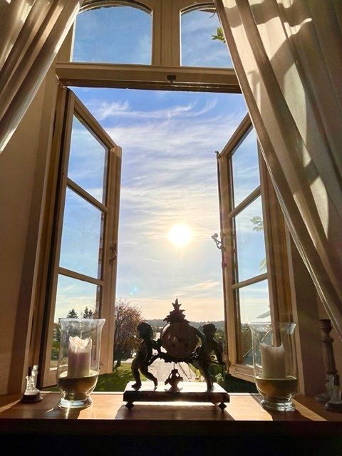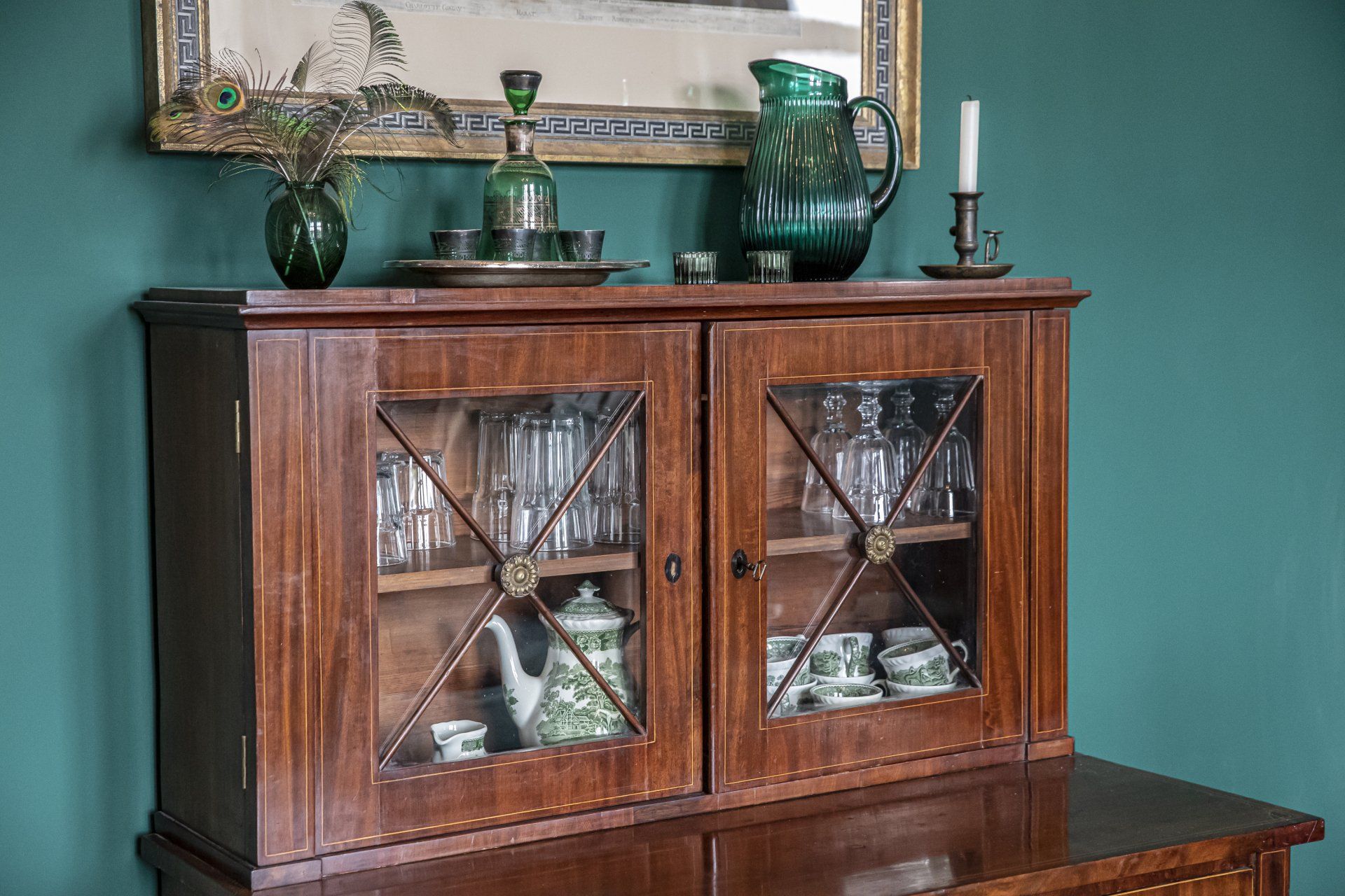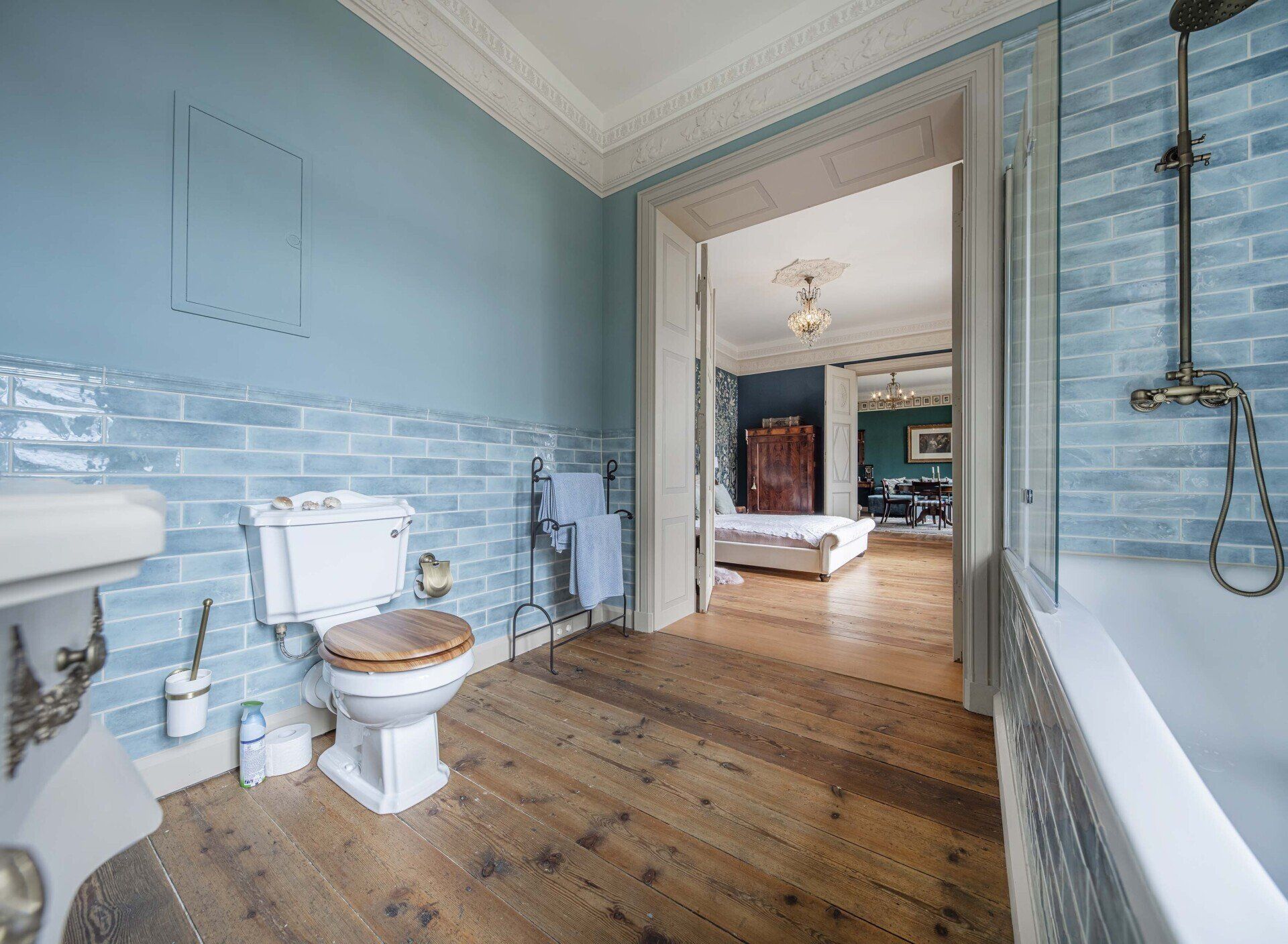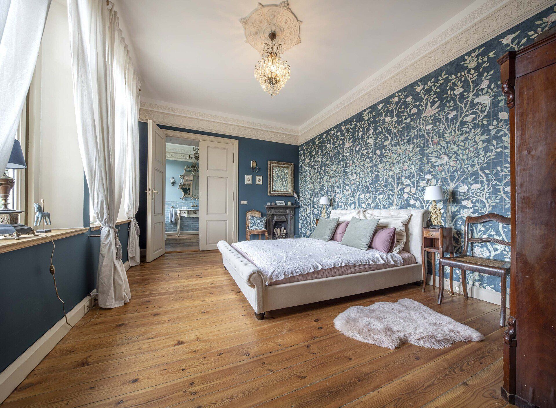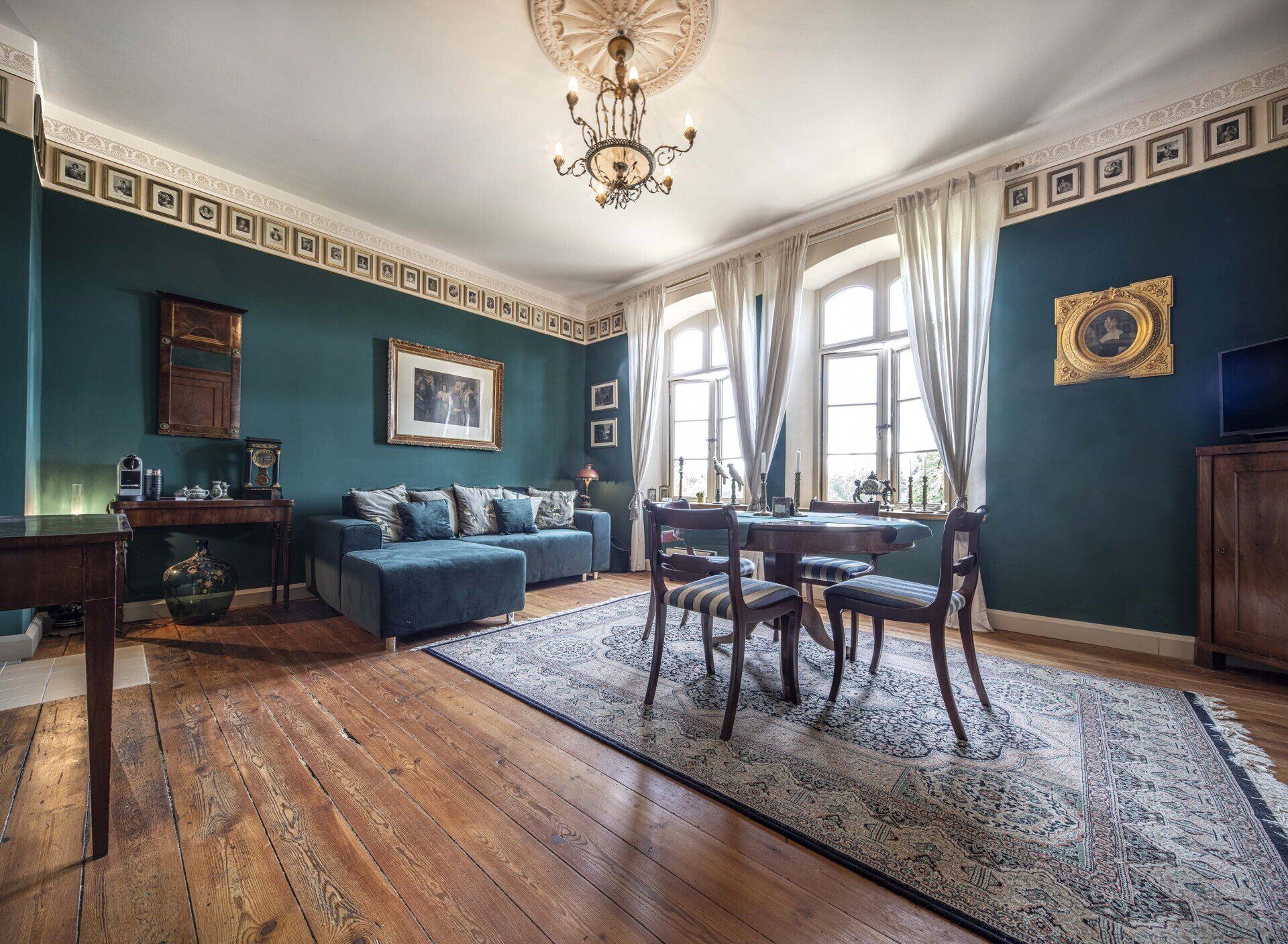Diese Ferienwohnung besticht durch ihre 14 Meter lange Zimmerflucht und bietet Platz für bis zu vier Personen. Unsere Alexandrine besticht durch ihre bauzeitliche Farbgebung, die heutzutage sogar sehr modern wirkt. Die südseitige Ausrichtung auf den alten Hof, sowie das Gewächshaus lässt sehr viel Tageslicht einfallen, welches die dunklen Wandfarben zum strahlen bringt und sich so die Pigmente des tiefen Malachitgrüns und Petrolblaus voll entfalten können.