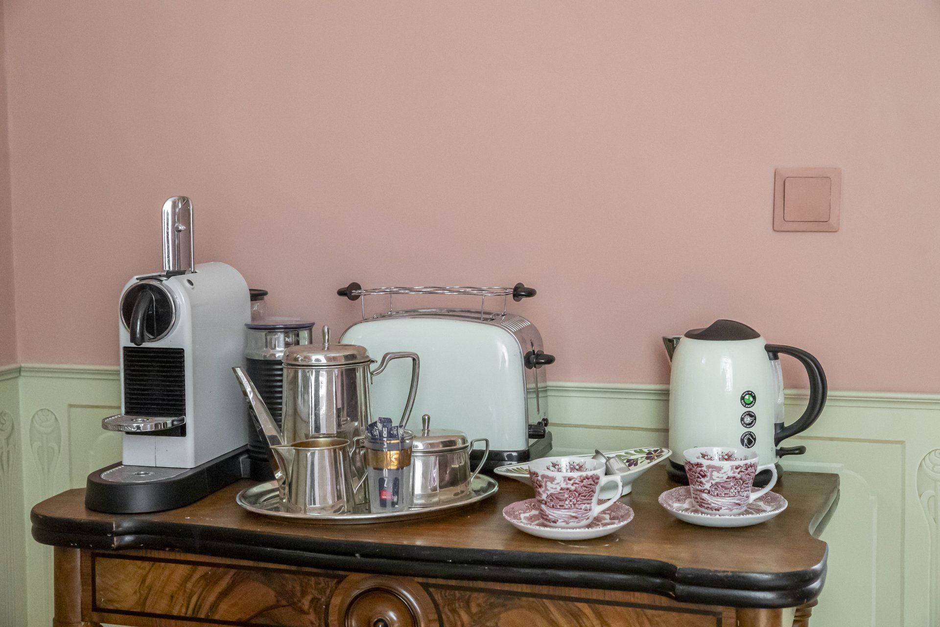 Das großzügig geschnittene Badezimmer besitzt eine 1,70m lange, freistehende Badewanne und einen wunderschönen alten Waschtisch, sowie die wichtigsten Utensilien um sich unkompliziert ein Frühstück oder eine Brotzeit auf dem Zimmer vorbereiten zu können.